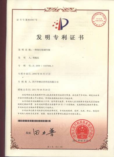 近日,由德阳华林自控分公司主持研发的“一种角行程调节阀”被国家知识产权局授权为发明专利,并颁发了专利证书。