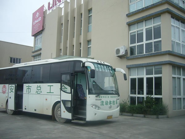 2009年11月17日早晨,随着一声刺耳喇叭声的响起,一辆大巴驶向浙江力诺调节阀有限公司大门口。原来这是由瑞安市总工会、潘岱街道工会组织的,对浙江力诺阀门有限公司工会会员进行免费体检的流动体检车到达了;顿时公司内沸腾起来了,因为这个难得的体检机会,力诺阀门工会100多名员工早已在公司内等翘首等待,虽然体检禁吃早餐,喝水,但是体检员工没有感觉到一点的饥饿,反而感到兴奋。