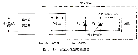 b.定位器输入信号4~20mA(直流)是由输出式安全栅供给的,其安全栅的最大输出电压小于(或等于)30V,最大输出电流30mA,因此限制了力矩马达中线圈绕组的储存能量,起到限压、限流的保护作用。