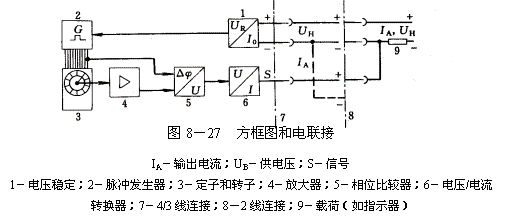 电动阀位传送器能把0°~340°的转角位移变换为和角度成比例的输出信号。这个信号是和载荷无关的直流电信号: 4/3线连接时为0~20mA。(图8-27) 2线连接时为4~20mA。 电子阀位传送器和开关元件、信号装置一样装在防爆电子执行机构上,调节阀维修量极少。