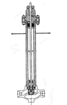 (1)阀杆必须通过长阀盖,并通过“冷箱”的厚绝热层,见图9-20。(2)为了避免快速热传递,通常使用空心阀芯。为了调节阀导向和节流的稳定性,阀芯的直径允许做得较大。阀芯中的空腔可以抽空或填进绝热材料或反射层,以减少辐射或对流热交换。(3)用传热性能差的材料。不锈钢因热传导性能比较差,所以是一种良好的材料,然而金属的横截面必须要最小。加长阀芯和导向之间的间隙应很小,以免对流。 图9-20 带有阀芯、阀座 环的“冷箱”阀门, 可与阀盖拆卸