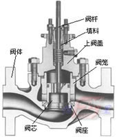 (1)直通单座调节阀 如图2所示,直通单座调节阀有一个阀芯和一个阀座。图中,阀杆与阀芯连接,当执行机构作直线位移时,通过阀杆带动阀芯移动。上盖板用于压紧填料,上阀盖与阀体用螺栓连接,用于阀杆和阀芯的中心定位。阀座与上阀盖一起,用于保证阀芯与阀座的中心定位,并在阀芯移动时,改变流体的流通面积,从而改变操纵变量,实现调节流体流量的功能。图中的阀芯导向采用顶导向方式。一些直通单座调节阀采用顶底导向方式,提高导向精确度。一些小流量直通调节阀常采用阀座导向方式。直通单座调节阀只有一个阀芯和一个阀座,是一种最常见的调节阀。其特点如下: