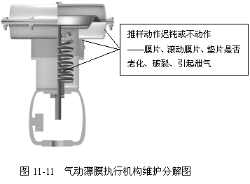 动作迟钝或不动作——检查膜片、滚动膜片、垫片是否老化、破裂、引起泄气,见图11-11。