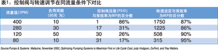 智能驱动器可以让泵的运行接近其最佳效率点(BEF),并且当泵运行偏离了最佳效率点时可以保护泵避免机械损坏,最新的研究表明,泵运行在最佳效率点附近可以使泵的效率和运行可靠性获得惊人的改善。表一中比较了不同流量需求下的控制阀的压差、泵转速和效率的波动情况。