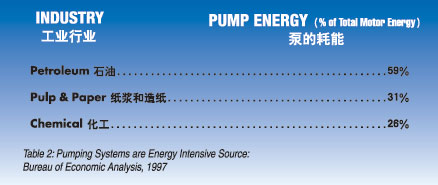 节能 如表2 所示,在纸浆造纸行业,泵消耗了大部分的电机耗能。实际上流程泵的能量集中消耗使他们成为节能降耗的主要选择对象。