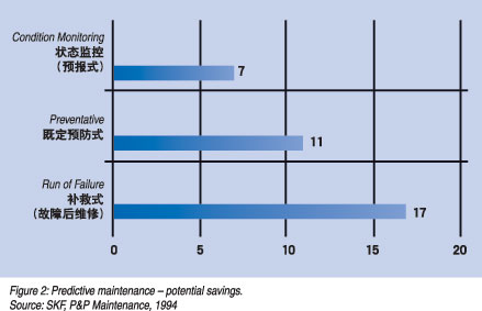 通过发展预报式维修的能力,维修保养部门可以实时持续地检查和更新设备状态信息。设备数据的实时分析提供切实可行的信息来计划维修作业,这样比执行一份自上次停车维修后的既定时间计划更加有效。较之既定计划维修主要的优点是延长了连续运行时间,增加了运行机动性,更重要的是降低了维修量。图2显示了预报式维修方式较之既定预防维修方式或补救式维修方式,其费用显著降低。