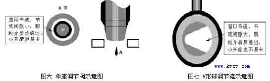 介质流经节流口时,在同样的节流面积条件下,如果节流间隙小,不干净介质不易通过, 容易堵塞;反之,则不易堵塞。对柱塞型阀芯(见图六),它的节流面积分布在圆周上, 其节流间隙大概等于面积除以圆周长;再看窗口型阀芯(见图七),其面积分布在窗口上 而不是在整个圆周上,所以其间隙大,颗粒很容易通过。由此可见,节流面积越集中(不是圆周分布),节流间隙越大,防堵性能就越好。这样的典型产品有“V”型球阀、全功能超轻型调节阀等。尤其在小开度工作时,前者的节流间隙更小,更易堵卡;后者集中在“V”形口的尖端部份,面积集中,充分显示了“V”形节流的防堵优势。