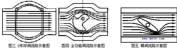(2)角行程的阀克服了直行程阀流路复杂和上下导向易堵卡的问题,介质流经角行程类 的阀,似乎是直接流进流出,最典型的就为“O”型球阀,就象直管道一样,其防堵性能最好, (见图三);其次就是全功能超轻型阀、蝶阀等,它们的节流形式见图四、五。