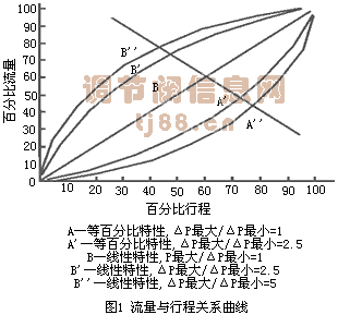 2、调节阀选择 2.1动态特性影响下的调节阀特性选择 选择合适的调节阀特性是设计控制回路最重要的阶段。调节阀同过程之间的恰当匹配,要求有专门为过程而设计的调节阀特性。实际上一台调节阀具有两种特性,一种是固有特性,这是调节阀在压力损失(ΔP)保持恒定的实验室条件下所表现出来的特性。另一种是工作特性,是指调节阀的工作特性是该调节阀处在过程的实际压力状态下时,其流量与行程之间的关系。Cv值表示的恒定压力损失下的液体流量。流量与过程的关系曲线见图1,表示了固有特性对不同压差的变化情况。当过程压差沿整个系统分布的高流量状态,变到大部分压差集中在调节阀上的低流量状态时,就会出现图1所示的特性改变情况。应注意,线性特性的调节阀,当被安装在一个压差较大的过程中时,会表现出快开的特性。应予考虑这种压差集中分布的变化。