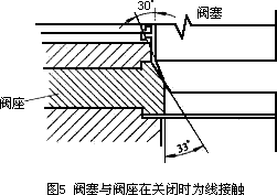 c)阀座及阀塞接合面之间有3°表面角度差,关闭时,二者为线接触,把阀门关得更加严密,见图5。