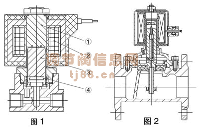 它分常开、常闭两种。图1为直动常闭电磁阀,在断电时,电磁阀呈关闭状态,当电磁阀线圈②通电后,产生的电磁力使动铁芯③与静铁芯①吸合,直接开启阀口,介质从进口流向出口,当线圈②断电后,动铁芯③在复位弹簧④的作用下复位,直接关闭阀口,而切断了介质的流通。如ZF、CA1、CD-F。常开式则断电时
