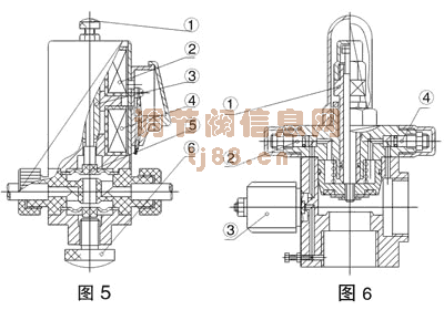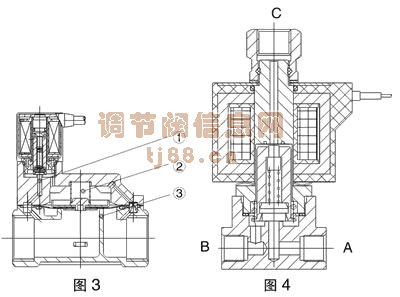 三、间接先导式电磁阀 它由先导阀与主阀组成,两者有通道联系着,如图3当电磁线圈通电,动铁芯与静铁芯吸合而导阀孔①开放,阀芯背腔②的压力通过导阀孔①流向出口,此时阀芯背腔②的压力低于进口侧的压力,利用压差使得阀芯脱离主阀座③,介质从进口流向出口。当线圈断电,动铁芯与静铁芯脱离,关闭了导阀孔①,阀芯背腔②压力受进口侧压力的补充逐渐趋于和进口侧平衡,阀芯因弹簧作用把阀门关闭。先导阀也可配常开式,如ZDF、CC、CF系列。