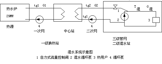 在混水泵站内,热用户供水与二级供水混合后,水温升到65℃,流量为G混进入热用户散热器,经散热水温降为50℃回到混水泵吸入口。流量为G混-G2,形成三级管网循环。