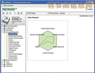 菱形图收集了动态偏差、静摩擦、静态负载、动作负载、滑阀位置、供气压力和温度的趋势。从阀门性能的角度,借助FDT/DTM技术,使用“阀门菱形图”可以在一个屏幕上实现六个重要趋势的可视代。阀门菱形图是FDT/DTM技术强大功能的最佳示例。它使设备制造商实现了所需直要功能的可视化。