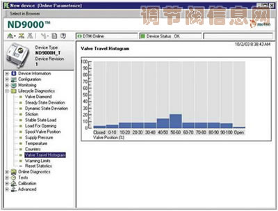 假设操作员发现流体控制回路中存在问题。问题可能出在控制阀、流量计或控制回路的调整参数。打开ND9000的DTM并且与实际设备的在线连接时,用户可以使用“监测”功能观察到信号发生变化时控制阀的响应情况。如果信号发生变化的,阀位总是相应变化,则阀门情况良好,由此可以排除潜在的问题原因。