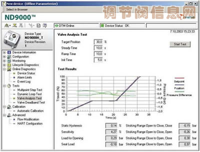 图表4显示了使用ND9000的DTM和HART通讯对控制信号和阀位的远程监测。阀门测试我们的重点是利用定期诊断提供的实时信息进行在线诊断,Metso同的还能提供阀门测试的工具。此时,FDT/DTM技术能显示已编入设备固件中的任何可能测试。例如,可以远程设置分步和滞后测试,并远程查看测试结果。阀门通讯的PC软件通常包括可以存储测试结果的数据库。随后可以将这些结果与之前或之后的测试进行比较以得出相应趋势。如果趋势表明性能不断降低,则表示阀门需要维护。