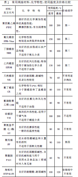 但是对热水洗、预脱脂、脱脂工位来说,由于在正常生产中槽液内会不断积累许多的油脂,三元乙丙橡胶在60∼140°C下耐油性不好,正常使用1∼2年左右密封面会老化开裂,所以热水洗、预脱脂、脱脂工位阀门的阀座一般选择聚四氟乙烯或Viton氟橡胶材料,常用阀座材料、化学特性、使用温度及价格见表2。
