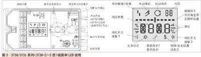 除上述层面外,显示还有五个可选的层面:Initialization mode(初始化模式)、Configuration(组态)、Manual mode (MAN)(手动模式)、Automatic (AUT)(自动模式)、Diagnostics(诊断)。显示下面有三个按键用于调看层面、查找数据和操作组态:为操作模式键、减少键、增加键。LCD为两行字符显示,上行为间隔有小数点的5个大字符主要显示阀位/数据/说明,下行左侧有2个字符主要显示故障信息/诊断代码,下行右侧有5个字符主要显示模式状态/故障说明/参数名/给定值/诊断名。