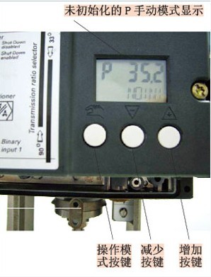 SIPART PS2智能阀门定位器在未初始化时的显示如图2,这是P-manual mode(P手动模式)显示层面,右下的NOINI闪动说明还未做初始化。此时显示当前电位器的百分比数值,用于检查电位器行程适应情况和调整反馈杆/电位器的中间位置。按减少键或增加键可使阀门定位器输出变化,让气动
