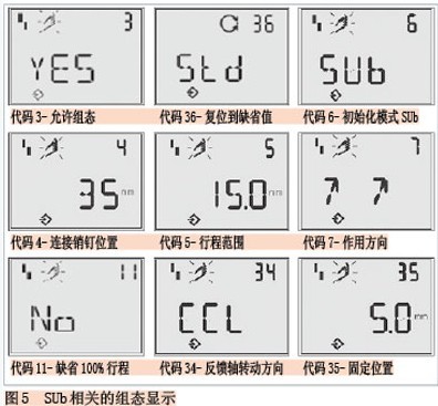 接通控制信号(送电),新装的智能阀门定位器工作后,用代码3确认允许组态(用旋钮按键选择到代码3,按下进入,代码闪动,选择YES后按键,LCD左下出现允许组态符号),用代码36进行复位使参数恢复到缺省值。选择代码6为SUb模式,参见图5。