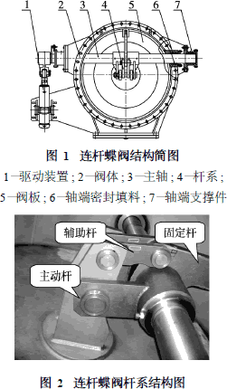 连杆蝶阀主要由驱动装置、阀体、主轴、杆系、阀板、轴端密封件、轴端支撑件等零部件组成,其结构简图如图1所示。