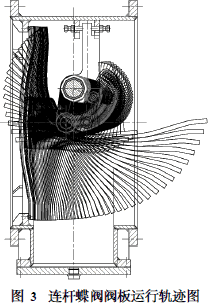 连杆蝶阀的主要技术集中在中间杆系部分,各连杆可分别定义为主动杆、固定杆、辅助杆。如图2连杆蝶阀杆系结构示意图所示,主动杆一端通过键或销与主轴相连,另一端连接到阀板上;固定杆通过主轴和阀体实现固定,在阀板的整个运动过程中起到固定支撑的作用,辅助杆一端与固定杆连接,另一端与阀板连接,在阀板的运动过程中起到实现一定轨迹的作用。连杆蝶阀的杆系部分可以看成一个四连杆机构,这样阀板在开启的瞬间可以实现一个垂直向上的运动,使阀板、阀体的密封面迅速脱开,如图3为连杆蝶阀阀板运行轨迹显示两密封面无相对摩擦,保证了