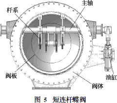 针对长连杆蝶阀的缺点,在国内又出现了短连杆蝶阀,如图5所示,短连杆蝶阀是在第一代长连杆蝶阀的基础上进行的优化设计,它继承了长连杆蝶阀优点,短连杆蝶阀产品可以看作连杆蝶阀的第二代产品。现在这种蝶阀产品广泛应用在国内外各大中小钢铁公司,如国内鞍钢、本钢、包钢、济钢等;国外有印度布山、巴西G/A等。主要应用在高炉热风炉和预热炉煤气、空气、烟气管道上,取代传统的闸阀,据用户反映使用状况都比较好。