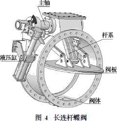 如图4所示,长连杆蝶阀是连杆蝶阀一种结构形式,它也是较早期的连杆蝶阀产品,我国是在20世纪90年代初期结合引进国外二手设备的基础上开始研发和制作此种结构的