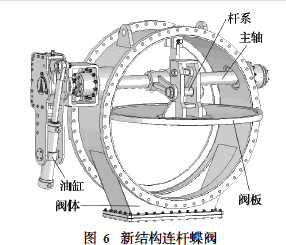 通过十几年的不断研究,结合产品实际运行情况经验的积累以及借鉴国外先进结构,将连杆蝶阀进一步改进和完善,其结构形式如图6。