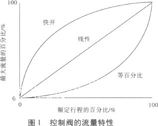 图1给出了典型的流量特性曲线,线性流量特性曲线表明流量与阀门行程成正比关系,这种比例关系提供一种具有恒定斜率的特性,所以在恒定的压力降下,阀门增益在所有流量处都是相同的