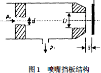 以常见的喷嘴挡板结构为例,其工作原理如图1所示,喷嘴挡板机构主要由恒节流孔、喷嘴挡板及背压室串联组成。工作时,气流(气压ps恒定)经恒节流孔进入背压室,当挡板远离喷嘴时,由于背压室内径远大于恒节流孔直径,空气经喷嘴排出,背压室气压几乎为零。当挡板紧密接触喷嘴时,空气不能由喷嘴排出,背压室气压等于进气压力。调整挡板与喷嘴间距就可以调整背压室气压。