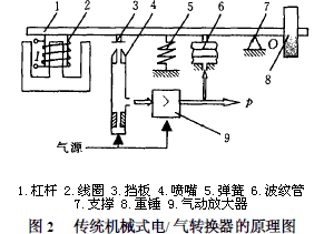传统的机械式电/气转换器工作原理如图2所示。当输入电流I增大时,线圈与电磁铁产生的吸力增大,杠杆做逆时针旋转,带动挡板靠近喷嘴,背压室气压升高,从而使波纹管气压升高,对杠杆产生向上的反馈力。由图可见,机械结构喷嘴挡板和整个转换器是一体的,机械部件易磨损,机构繁杂,调节环节多,抗振动冲击性差,任何一个部位出现磨损或其他故障,整个生产都要停下来,维修、调整费时费力。但是,这种转换器或定位器具有价格低廉、使用安全、防燃、防爆等优点,目前我国大多数企业仍在广泛使用。