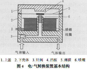 图4是美国Bland公司生产的一种用于电子式电/气转换器中的转换装置,其转换单元采用质量很轻的膜片作为喷嘴挡板,当线圈通入直流电流时,中间铁心被磁化,吸引质量很轻的带硬心的平膜片使其产生位移,从而改变背压室压力。平膜片质量轻、惯性小。转换装置通过塑胶垫与底座插拔连接。这种全封闭软磁包容结构,使转换装置的变换精度高、效率高、能耗小、响应快,代表了当前转换器的先进技术。可以看出该结构具有如下特点:①采用插头式的模块形式,便于用户进行现场维修。当电/气转换器出现故障时,一般只需拔下电/气转换模块,换上新模块即可,不需要重新接线或断开管路,也无需再次标定,所以不改变实际的作业流程。②气路、磁路一体化,结构紧凑,缩短了气流管路,压力信号滞后小。③弹性膜片是唯一的可动元件,且质量非常小(小于1g),惯性几乎可以忽略,这样就消除了安装姿势对转换器特性所产生的影响,并有效地提高了动态响应特性。