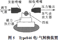 美国Rosemount公司开发出了通用的电子化的电/气转换器Type846,其转换装置结构如图5所示。磁力执行器作为喷嘴挡板,由永磁铁和线圈组成,挡板部分是一个圆柱体,当它靠近发射喷嘴和接收喷嘴时,遮挡气流,输出气压降低,反之,气压升高,接收喷嘴的压力将随着圆柱体的位移而变化。线圈电流由电路提供和控制,电/气转换器整体是一个闭环电子控制系统。由于转换装置在结构上是模块化的,作为一个功能模块,很容易移植到其他产品中。Type846磁力执行器转换装置获得了发明专利,并应用在该公司开发的数字式智能型阀门控制器中。