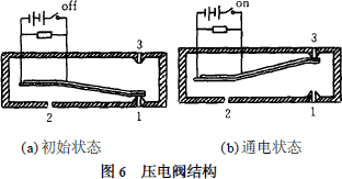 控制阀(5),其动作原理如图6所示。图6a是压电阀在初始状态下的示意图,即不通电时,功能陶瓷片作用在喷嘴口1上,这时,喷嘴口2和喷嘴口3与先导腔连通,形成一个整体。当压电阀连通电源时,如图6b所示,功能陶瓷片变形向上翘,把喷嘴口3压住,使喷嘴口2与喷嘴口1连通。压电转换元件采用两个压电微型阀,压电阀只有通和断两种状态,需要加大阀门开度时,则打开进气阀,否则打开出气阀,状态稳定时,两阀均处于切断状态,将执行器锁定在设定位置,和传统定位器相比较,其气源损耗几乎可以忽略不计。