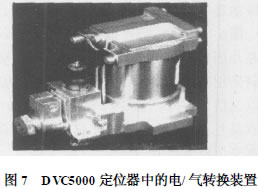目前,智能定位器的开发引起各大仪表公司的关注,但是,定位器功能都大同小异。图7是美国FISHER—ROSEMOUNT公司生产的DVC5000智能阀门定位器中电/气转换装置照片。当有电流通过线圈时,磁化线圈铁心,吸引上端盖使其产生微小位移,与上端盖一体化的U型弹性梁起到位移放大作用,喷嘴可前后移动。和传统的喷嘴挡板结构相比较,其气压初始值调整更加方便灵活,电/气转换性能稳定,结构制作精良,体现了精美的设计思想。文献(7)利用自行设计的正平面弹簧结构,成功地应用在电/气转换阀门上,拓展了我们的思路。