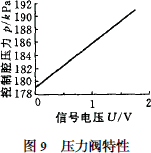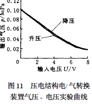 所示。由图可以看出,在这组参数组合下,输入电压在0~5V之间与输出气压基本上是直线关系,在5V之后,压电双晶片变形较大时,输出曲线有较缓和的变化,驱动电压在0~8V左右就可以满足输出气压0102~0110MPa的要求,且升降压之间的迟滞也非常小,使控制更加简单易行。