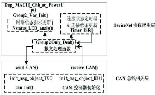 DeviceNet协议栈由两部分组成,CAN总线相关层与系统具体使用的CAN控制器有关,包括数据传输波特率设置,CAN通信初始化和接收发送CAN数据等内容。上层程序解析了DeviceNet协议应用层部分内容,主要分为5个部分:设备上电重复MACID检测;仅限组2变量初始化;仅限组2报文处理函数;网络状态指示灯状态更新;网络连接状态定时器负责实时更新各种网络连接的状态。其中仅限组2报文处理函数实现了DeviceNet协议栈的大部分内容。