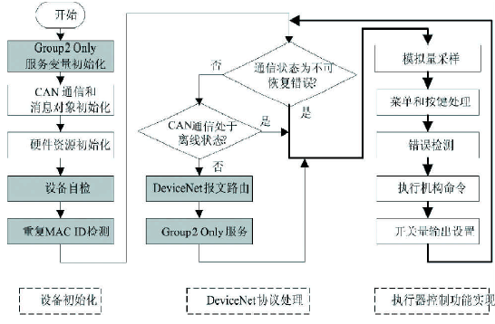 程序的流程大体可分为系统初始化、DeviceNet协议处理和电动执行器控制功能实现三个模块,而灰色部分为DeviceNet协议规定的内容。