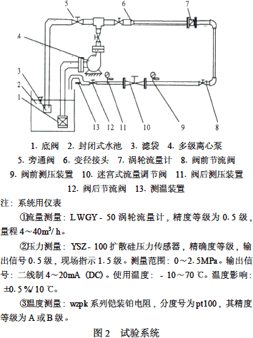 气动调节阀和实验室的具体情况,设计此试验系统(图2),水槽中的水由多级离心泵升压,流过流量测量段进行流量计量,然后进入迷宫式调节阀,最后经回水管返回水箱。在设计的试验管段前后,分别装上压力传感器及温度传感器,在保证试验管段保持紊流,即保证阀雷诺数R