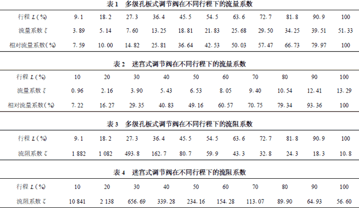 运行时,首先调节节流阀使压差具有适当值,然后调节被测试流量调节阀的开度,使其达到预定值。调节流量完成后,待系统稳定开始采集压差和流量等原始数据。多级孔板式调节阀和迷宫式调节阀的流量特性和阻力特性测试结果见表1~表4。多级孔板式调节阀和迷宫式调节阀的流量特性和阻力特性对比曲线见图3、图4。
