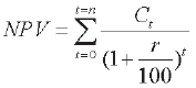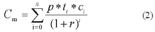 为了核算不同时段气动执行器的费用投入情况,需要将递增成本通过贴现现金流量法转化成当前(购买时)成本,即净现值(NPV)。这种方法主要综合考虑利率和通货膨胀,形成贴现率(r),从而使投资总成本的计算在货币的将来值基础上进行。其计算公式为: