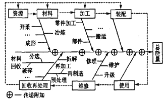 由于能源单位和实物形式有多种,因此在进行能源统计时,把不同的能源都折算成标准煤,折算系数可用当量热或者等价热。动态性是产品全生命周期能量消耗的重要特点,产品能量分析必须考虑到能量的动态性能。能量的消耗贯穿于产品全生命周期内的各阶段。如图4所示。图中虚线为物料流实线为能量流,加号表示传递及附加行为所消耗的能量。