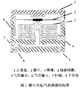 电气转换器结构如图1所示。首次采用全闭环磁路包容喷嘴/挡板结构和小惯量复合膜片,响应速度快、变换效率高、变换路径短、抗冲击、屏蔽性好。实践中发现,弹性薄膜片失效是转换器失效的主要方式,本文针对这一问题进行了较深入研究。