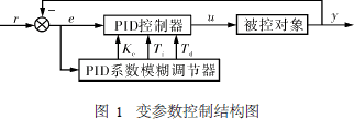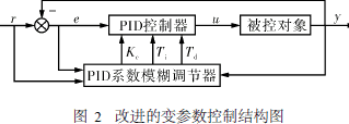 本文采用PID参数同时与设定值r、当前测量值y及偏差e进行关联的变参数控制,使PID参数既能适应工作点的变化,又能根据偏差e适时调节以提高控制性能,其结构如图2所示。
