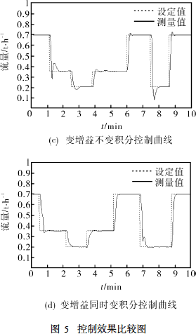 通过图5设定值在0.7、0.34、0.18之间作阶跃响应可以发现,固定PID参数无法实现好的控制效果。若将控制器比例带设为较小值(即比例增益较大),则在流量设定值较大时能较好地控制,响应速度较快,而在设定值较小时产生振荡无法稳定;若将控制器比例带设为较大值(即比例增益较小),则在设定值较小时能较好地控制,而在设定值变大时调节速度太慢。通过引入变增益控制,极大地改善了控制性能,使流量稳定工作点不管在高位还是低位都有较好的控制效果,但对于超调尚不能有效消除;进一步引入变积分控制,在保证系统无静差的同时基本消除了超调现象,控制性能最佳。