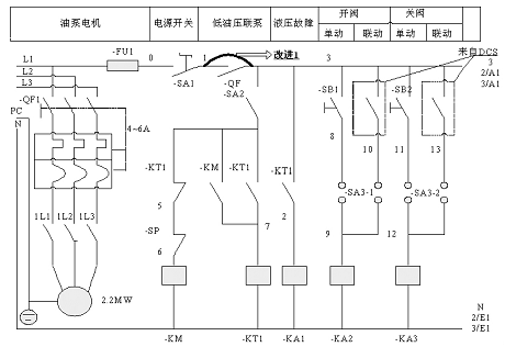 在图1中,左半部分为油泵电机的控制回路。回路送电后,先给油泵电机送电,再通过开关-SA1和-QF给后面控制回路的供电,其中-SA1为电源开关,-QF是油泵电机过载信号。后面的开关-SA2为油压低联启泵的联锁开关,-SA2投入后,当液压低于14.5Mpa时,开关-SP会自动闭合,线圈-KM也会闭合,油泵电机会联锁启动,同时-KT1闭合,发出“液压低:报警信号。