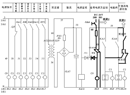 其次增加一路备用电源,备用电源由电气UPS直接提供,以保证供电的可靠性,备用电源经过变压器变成24VDC电源直接供给蝶阀的两个控制电磁阀,这样当蝶阀控制回路的电源丢失时,电磁阀仍然带电,不会关闭。见循环水出口蝶阀控制原理图3中的改进2处。
