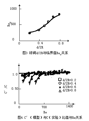 2、球阀流量系数在很小范围内随Re 变化,Re存在临界值Re