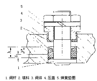 阀杆、环形凸缘的阀体孔、填料、弹簧垫圈、螺母及顶压螺母等组成。当旋紧螺母时,压缩弹簧垫圈.并带动阀杆向上移动。在阀杆凸台与垫片及阀体孔环形凸缘的共同作用下,挤压上下填料。此时填料压缩, 轴向压缩量为δ。